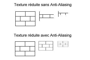 ![]() Dans l'exemple ci-dessus on peut remarquer que des détails de la textures disparaissent lorsque l'on réduit la texture sans se préoccuper de l'aliasing. Alors que le résultat avec anti-aliasing est bien meilleur. Plusieurs solutions d'anti-aliasing sont possibles pour résoudre ce problème: