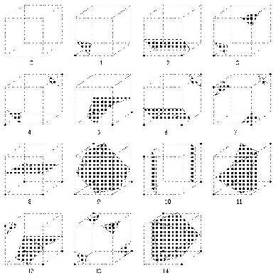 Le principe des " Marching Cubes " est de subdiviser le volume où se situe notre surface en petits cubes ou parallélépipèdes. On progresse alors dans notre volume cube par cube et on vérifie si la surface intersecte chaque cube. Si c'est le cas on approxime la partie de la surface concourante avec le cube par une ou plusieurs facettes. Une étude approfondie nous montre qu'il ne peut y avoir que 256 " types " d'intersection qui peuvent se ramener à 15 cas si l'on joue sur les rotations et symétries. Pour se référer à cette table de possibilités, nous avons besoin de numéroter les arêtes et les sommets de nos cubes et de comparer la valeur de chaque sommet à l'isovaleur de la surface recherchée. La qualité du résultat obtenu dépend de la dimension des cubes (correspond à la résolution du maillage).