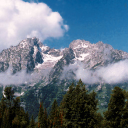 A four-screen video wall, each screen created by stamping out one fourth of a mountain texture image and using a TextureTransform node to translate the texture cookie cutter. |