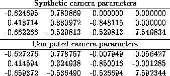 Figure 6 demonstrates the principles involved on a wholly synthetic image (useful for judging accuracy). A cube was modeled and imaged by a synthetic camera with known parameters, and the idea is to recover the position and orientation of the cube from the image. It can be seen that the method performs very well, and this is confirmed quantitatively in table 1 comparing the parameters of the synthetic camera with the camera parameters determined by the calibration procedure.