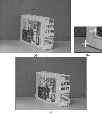 The next level of difficulty is on what we term ``realistic'' imagery, that is, real images but of man-made, generally rectilinear, environments. This is the situation confronted by mobile robots evolving in building interiors, for example. In fig. 7(a) we show the image of a textured box taken by a video camera in the laboratory (the image is intentionally simplistic, we have created a somewhat more elaborate ``artificial artificial reef'' in the laboratory for running more comprehensive tests), and the six features extracted for calibration. Manual selection of these corners can be subject to error, hence we have used an efficient corner and vertex detector [7] which works to subpixel accuracy directly on the grey levels of the image. The user has only to indicate a rectangular zone containing the corner. Very good results have been obtained on these types of images, as in fig. 7(b) showing a close-up of one of the selected corners. Figure 7(c) shows the superposition of the 3-D model onto the image of the object. The projection has been performed using the calibration matrix computed from the features of the image.