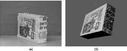 Figure 9(a) shows an image of a textured test object taken in the laboratory with superposed wireframe showing a triangulation of its faces, and 9(b) is the object seen from a different point of view. The crucial difference is that 9(b) is no longer an image taken with the camera from a different position, but a different view of the sythetic object onto which the texture extracted from the image has been mapped.