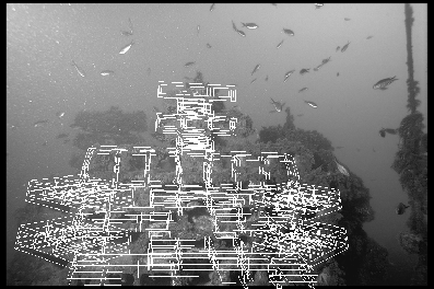 The real-world case is of course much more difficult than either the synthetic of realistic situation shown above. It cannot be guaranteed that the reefs that have been sunk in the reserve still correspond exactly to the 3-D model of the initial design. Furthermore, the colonization of the reefs by underwater life-forms has altered their shape, e.g., the edges of the blocks that compose the reefs are covered by concretions, and sharp corners can be difficult to distinguish, see figs. 3, 8.