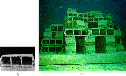 Two different types of artificial reefs were constructed from the rough-wall concrete blocks, the first in the form of a truncated pyramid and a second model in the form of a hollow octagonal structure. The latter type seemed more satisfactory in allowing better light as well as providing a large shaded area in the central shaft, and, importantly for us, the underwater structure is reasonably well represented by a CAD model. Figure 3 shows typical images of an artificial reef in the underwater reserve. Note the difference in the quantity of organisms on the reef between figs. 2(b) and 3 (seven years later).