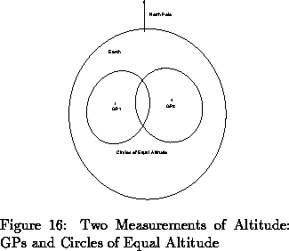 At any given time, a measurement of Sun altitude constrains the observer to be in a circle on the terrestrial surface. Such a circle is called circle of equal altitude. A circle of equal altitude is defined by a measurement of Sun altitude and knowledge of the GP of Sun. Two measurements of altitude are enough to constrain the observer to two points; three measurements are enough to constrain the observer to one point. More measurements of altitude overconstrain position and can be used to check or correct previous measurements. Figure 16 illustrates a situation where two stars are measured, yielding two possible solutions. In general, the solutions are very far from each other and one can be discarded based on other sources, for example, dead reckoning.