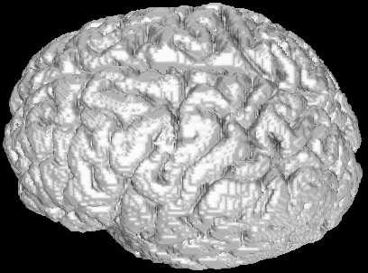 The picture above show a magnified display of brain surface constructed by using marching cubes. ~>
