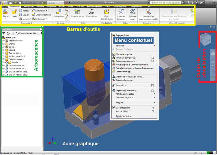 Les barres d'outils (zone jaune ci-dessus) s'adaptent en fonction de votre environnement (assemblage, création de pièces, mise en plan, tôlerie,...). Seules les commandes qui peuvent être utilisées apparaissent dans le menu et sont disponibles. L'arborescence (zone verte ci-dessus) permet de retrouver, de comprendre, de modifier la hiérarchie de la construction. Le menu contextuel (zone blanche ci-dessus) est obtenu avec la touche de droite de la souris. Il est énormément utilisé. Les icônes indiqués dans la zone