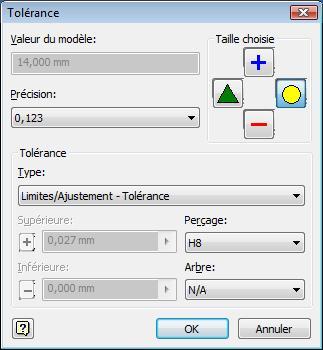 Création d'un modèle géométrique en vue d'une fabrication Cotation en cote moyenne Les procédés numériques d'obtention des pièces nécessitent des programmes issus directement des modèles CAO. Il est donc nécessaire que ces modèles utilisent les dimensions réellement souhaitées (cote maxi, cote mini, cote moyenne, ...). Dans les cas du corps, de la cale pentée et du cylindre d'appui apparaissent des cotes bi-limites (H8, g7). Corriger les modèles de ces pièces afin d'avoir systématiquement des cotes moyennes en utilisant les icones "Taille choisie" de la fenetre "Tolérance".